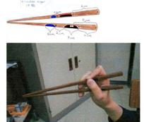 澳门培正中学附属小学学生张晓怡一次吃饭时看到外国人不会用筷子,想到如果能让从未握过筷子的人容易学会握筷子的正确姿势就好了。她准备了一双木筷子、几只不同颜色的笔,然后画出易握筷子草图,按手指比例,用不同颜色的笔在筷子上涂上手指应放的位置,并在旁边写上手指编号。使用者可根据说明书寻找编号的位置,继而学会握筷子的正确姿势。