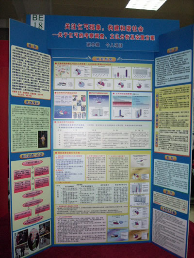 有些人喜欢用电脑喷绘制作,这固然可以做得很精致美观,但代价毕竟太大,我们并不提倡:有些学生喜欢给版面做一个大幅的背景画(或背景色),而背景颜色又做得很深,使叠在上面的文字图表的颜色和其反差没有足够大,因此看起来很费力。这是不足取的,因为展板传递给观众的毕竟是版面上的内容而非你的美术功力,过度的美化只能给人累赘的感受,只有恰当的美化才能给人惬意感。美不一定要花很高的代价,—些学生选用浅色的彩纸,用普通的打印机按段落分段打印,然后再贴到指定的板上。由于分段打印,段与段之间自然分割,反显得非常清晰。只要每段的长短适当,再配上彩色的标题和图表,同样可以使版面做得很典雅美观。