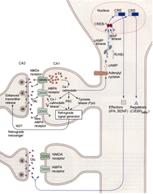 环腺苷酸与蛋白激酶A发生相互作用,把信息传到细胞核,影响基因的表达,促使新的突触蛋白合成,使神经元之间原有的突触有更多的受体和离子通道,或者使神经元之间形成新的突触。这样,神经元之间的信息传递效率就会显著地增强。