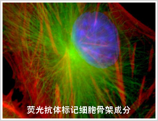 如图所示。荧光抗体标记细胞骨架成分,红色显示微丝,绿色显示微管,蓝色显示细胞核。