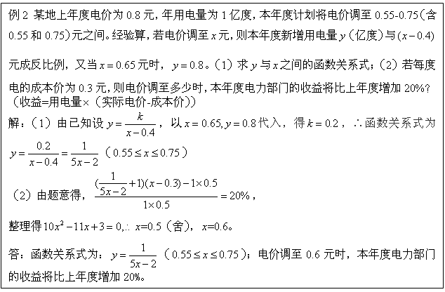 本例考查反比例函数的应用,建立数学模型求得电价。这一过程,考查学生分析问题解决问题的能力,为高中学习建模思想打下基础。